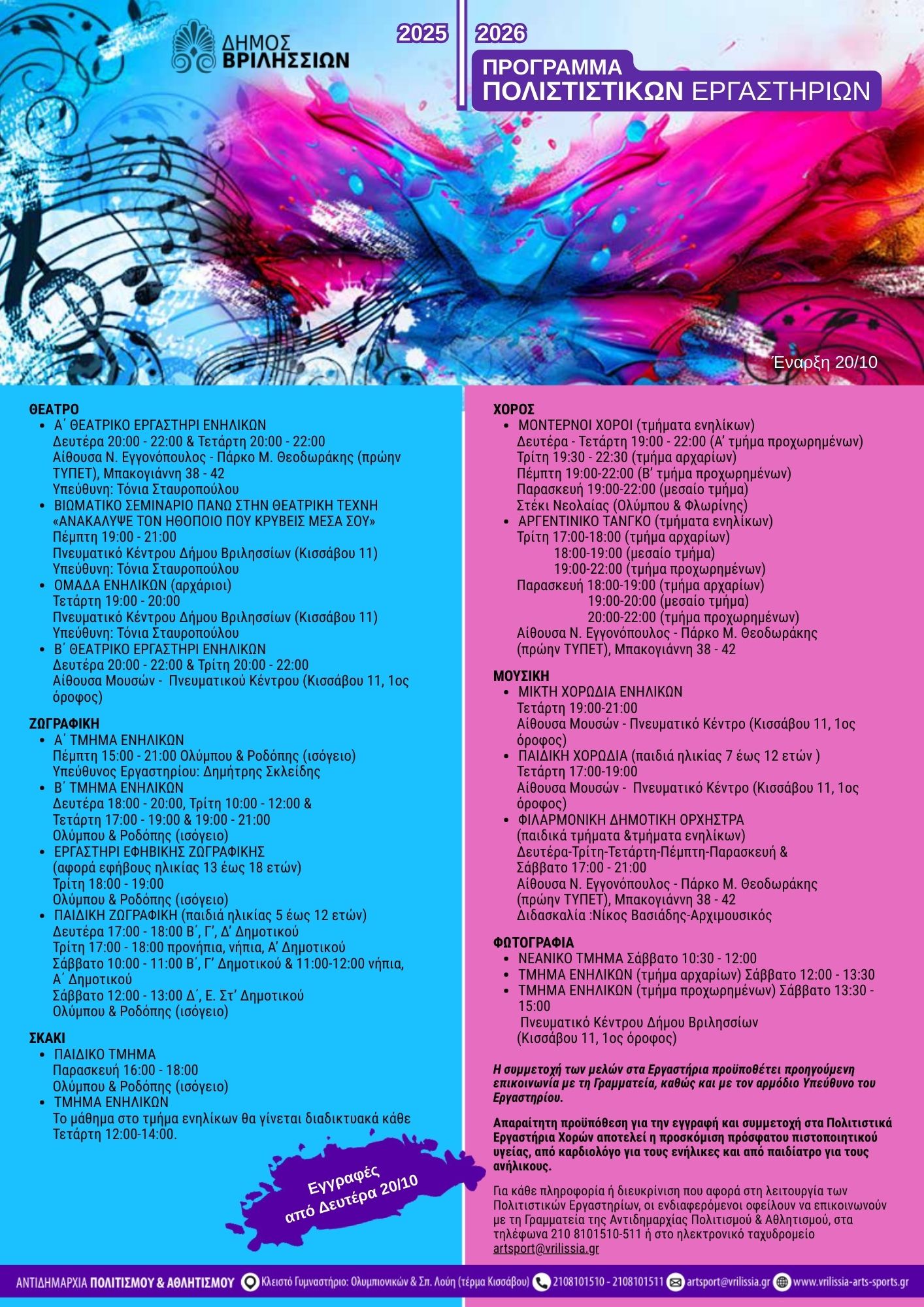 Aπό Δευτέρα 20 Οκτωβρίου ξεκινούν οι εγγραφές στα Πολιτιστικά Εργαστήρια του Δήμου Βριλησσίων 2025-2026.