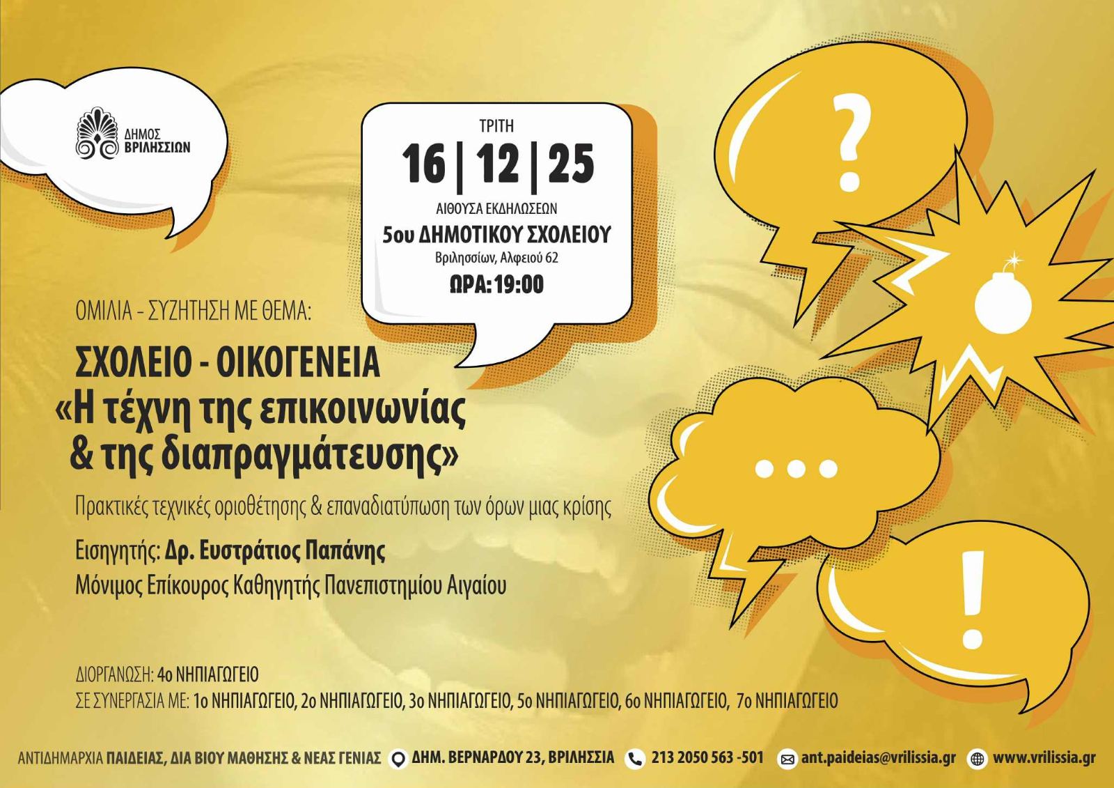 «Σχολείο και Οικογένεια: Η τέχνη της επικοινωνίας και της διαπραγμάτευσης» Η εκδήλωση θα πραγματοποιηθεί στο 5ο Δημοτικό Σχολείο Βριλησσίων (Αλφειού 62).